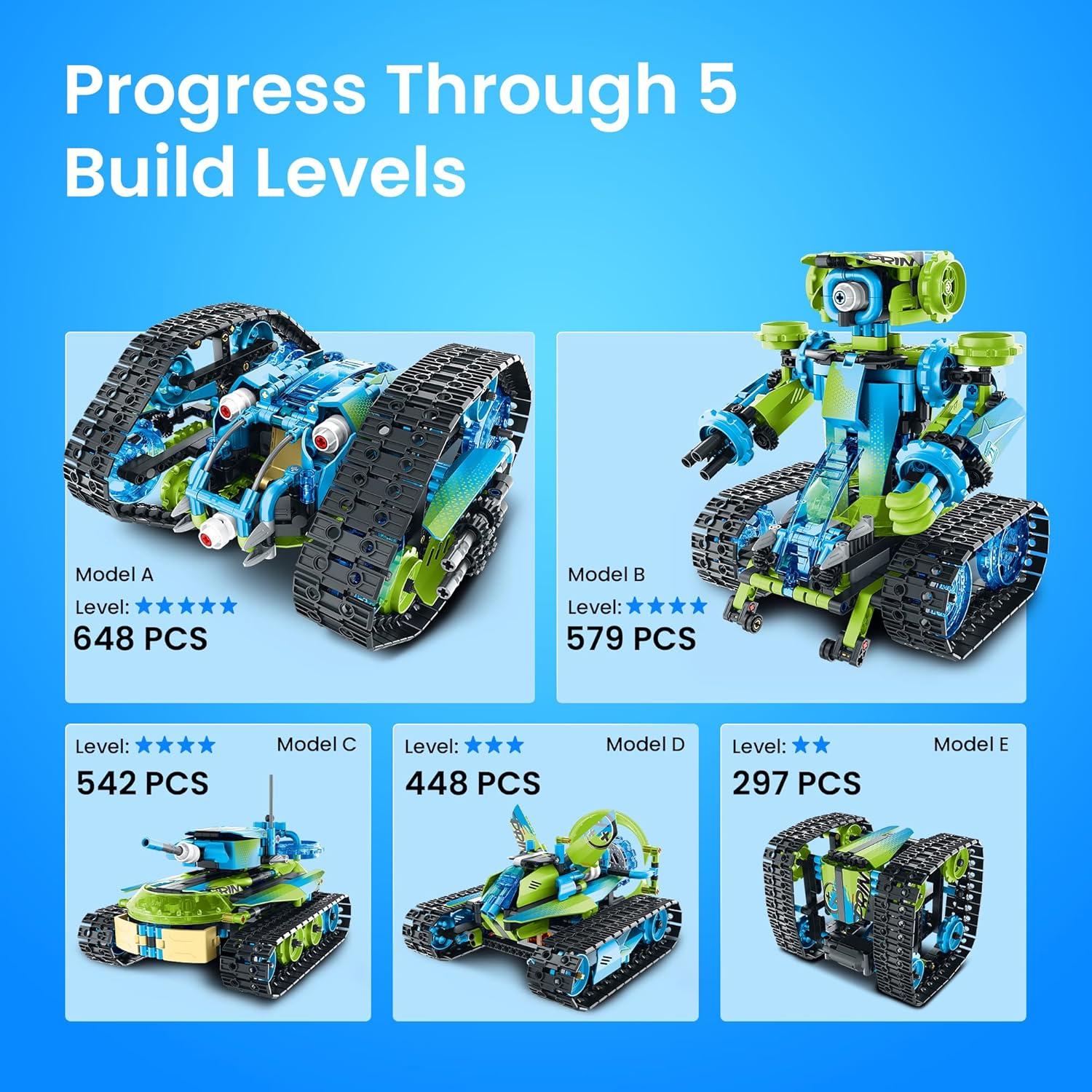 đ5-in-1 Buildable Design: Build a stunt car, robot, tank, and more with this blue-green learning kit for endless fun. Five models feature different difficulty levels, and boys and girls can choose simple or complex builds or use imagination to create unique designs