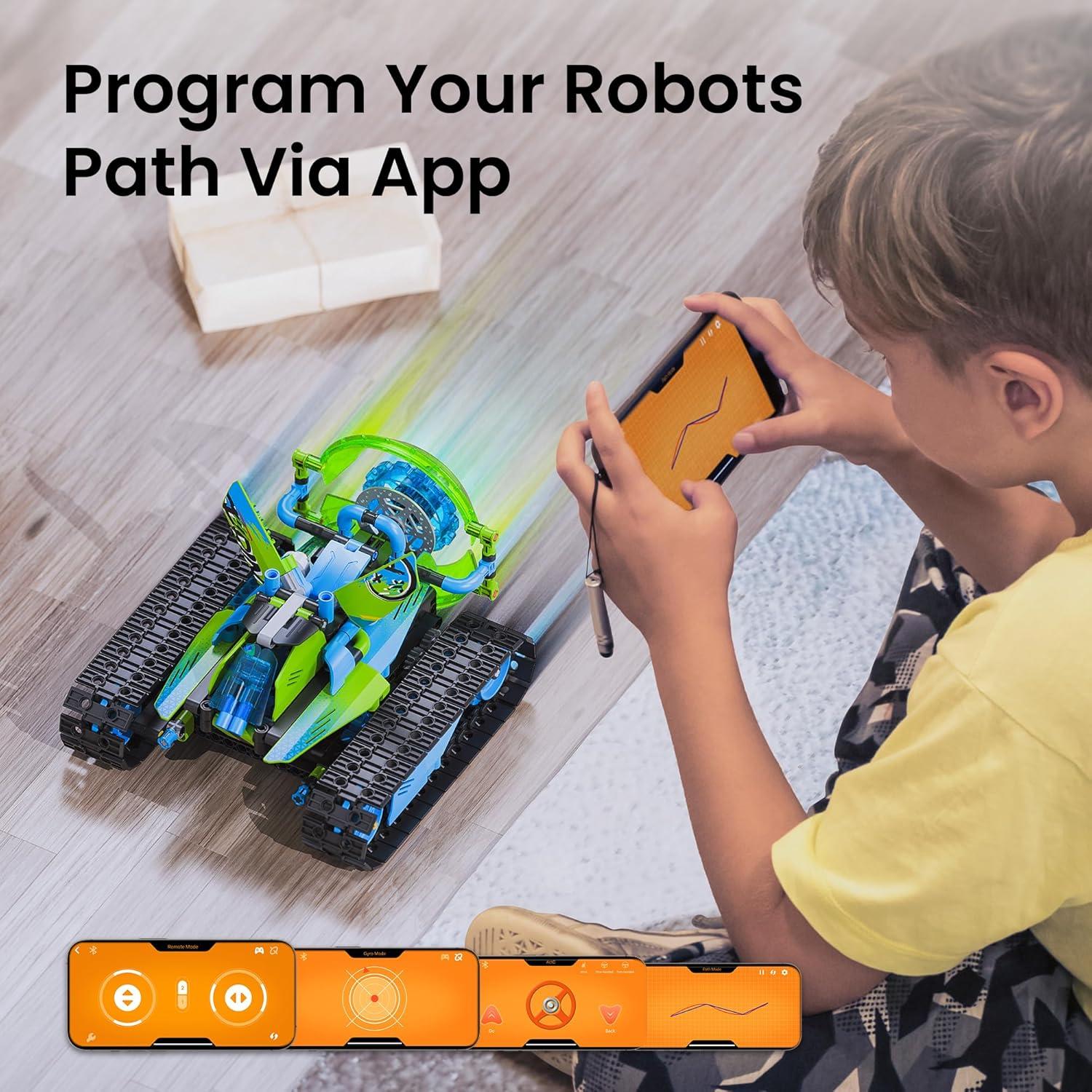đąAPP & Remote Control: Kids can control the robotic kit with a remote or use the Bluetooth app for programming and creative play. The app offers gyroscope and path modes for precise movement along drawn paths