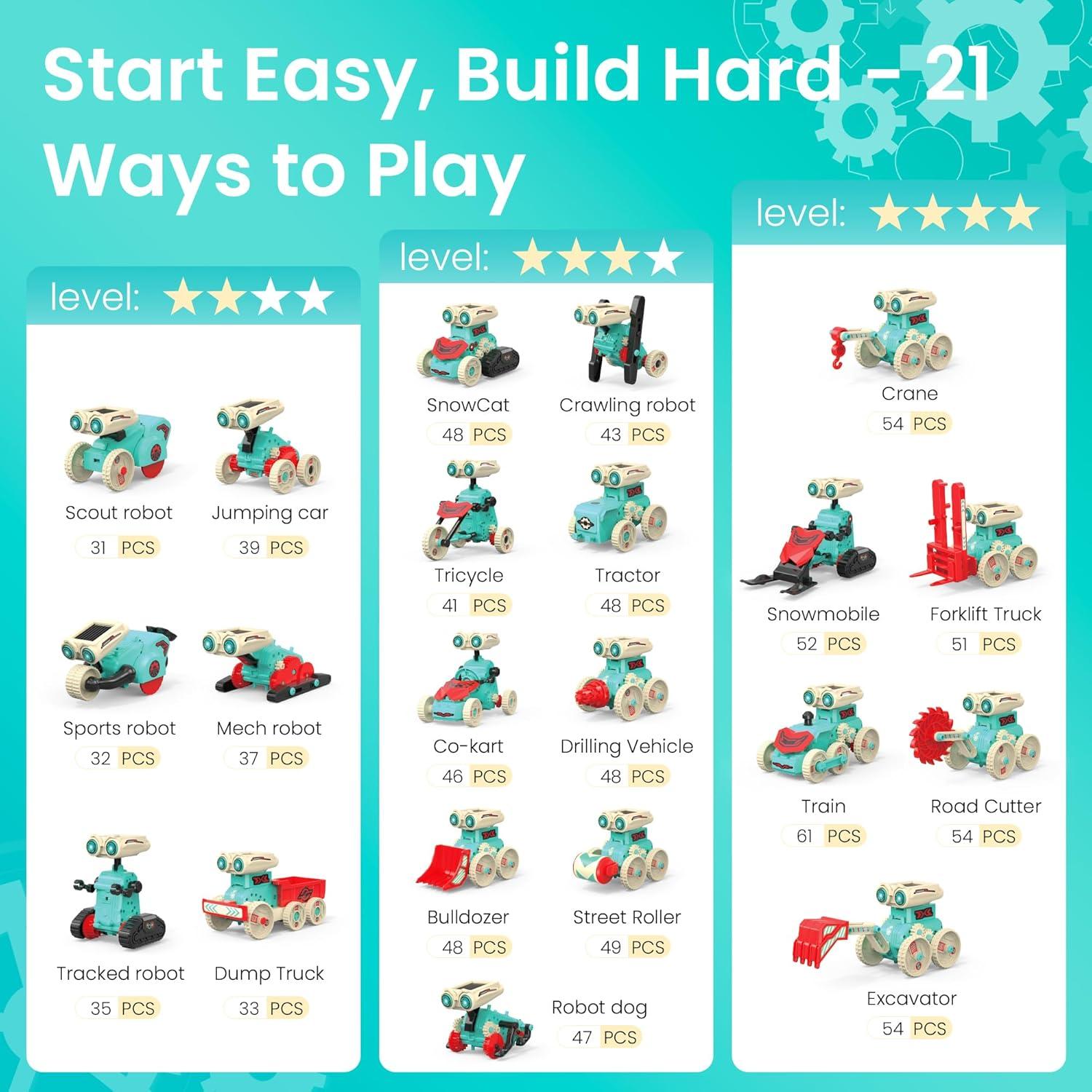 🔧 21-in-1 Robot Design: With 211 pieces to build 21 robot models, including robots, trucks, motorcycles, and others. Models vary in difficulty, letting children progress from simple to complex builds, boosting skills and fun through repeated rebuilding