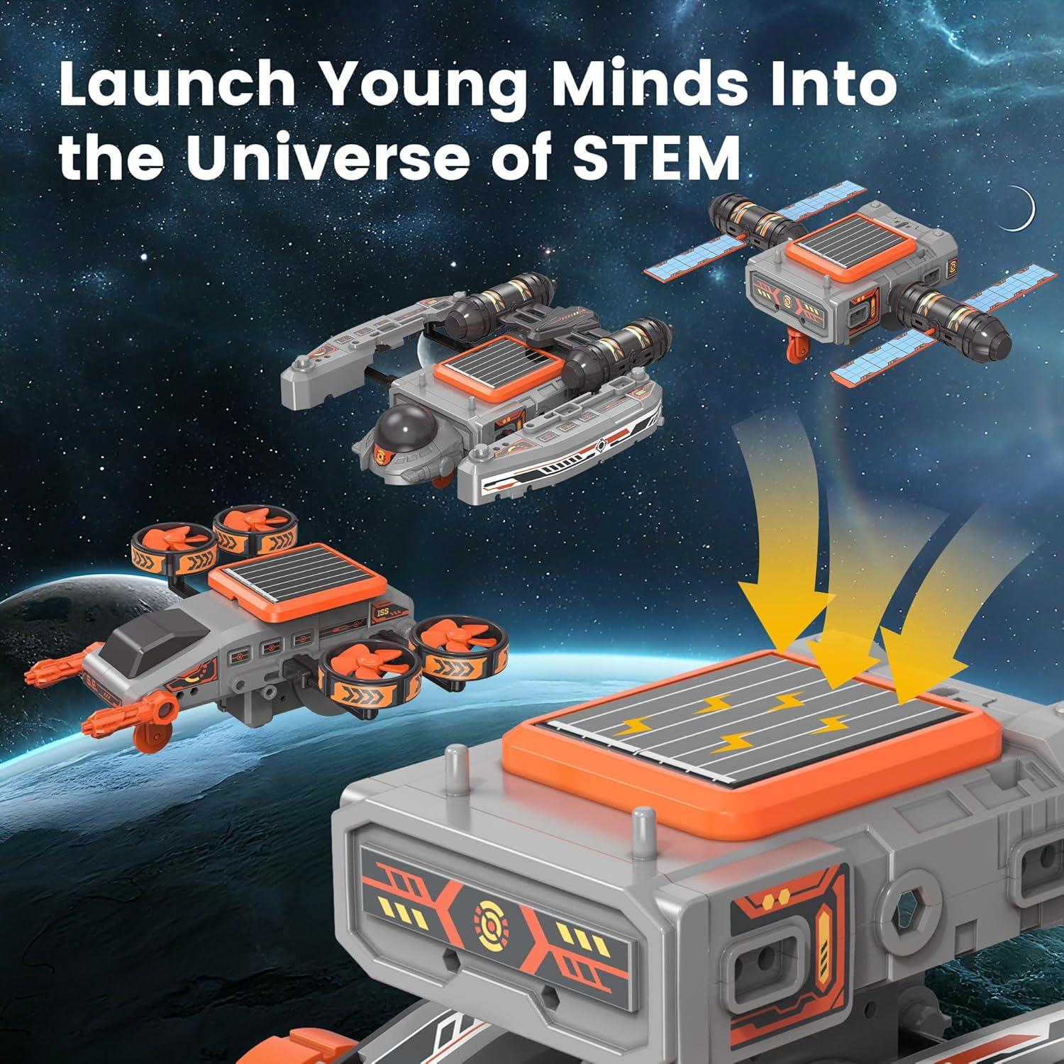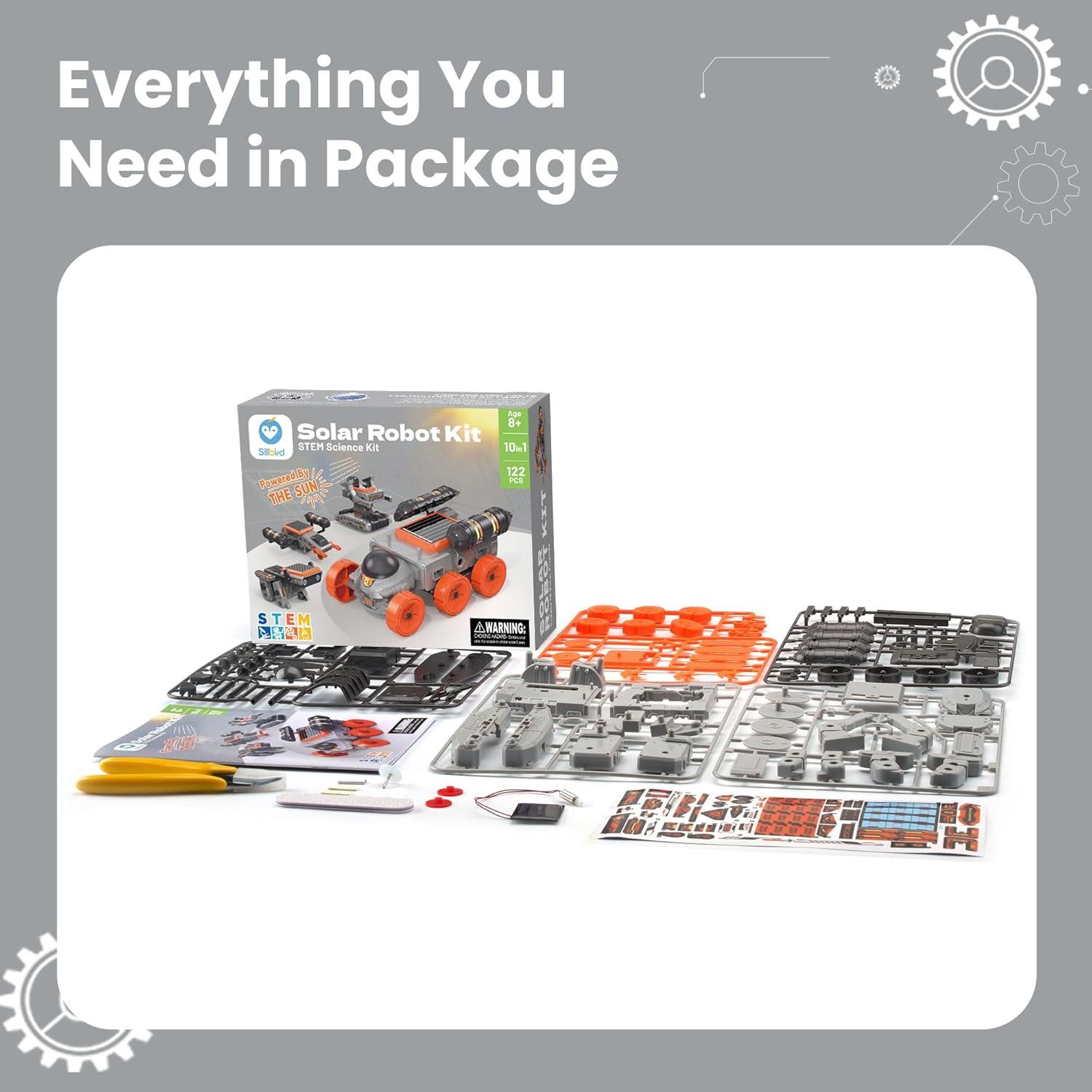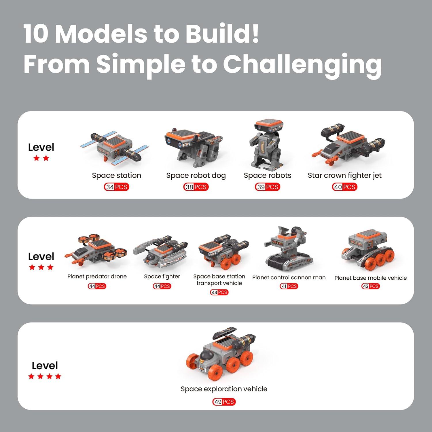 🤖 10-in-1 Robots to Build: This 112-piece solar robot kit lets kids create 10 unique models, including cars, robots, and space explorers. Each design features progressive difficulty levels—from simple to advanced, or DIY build own robot